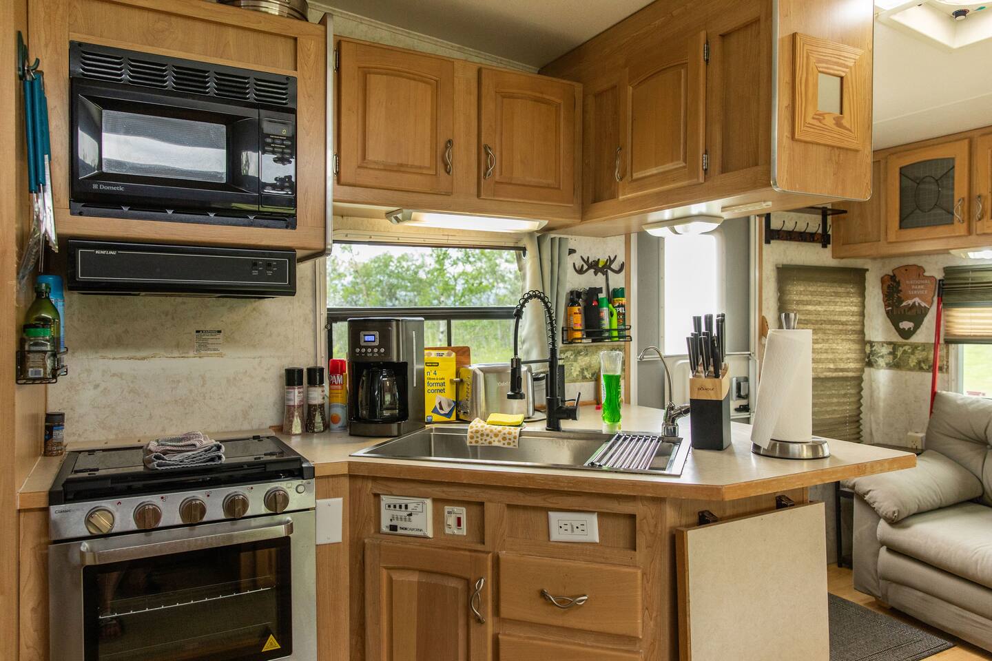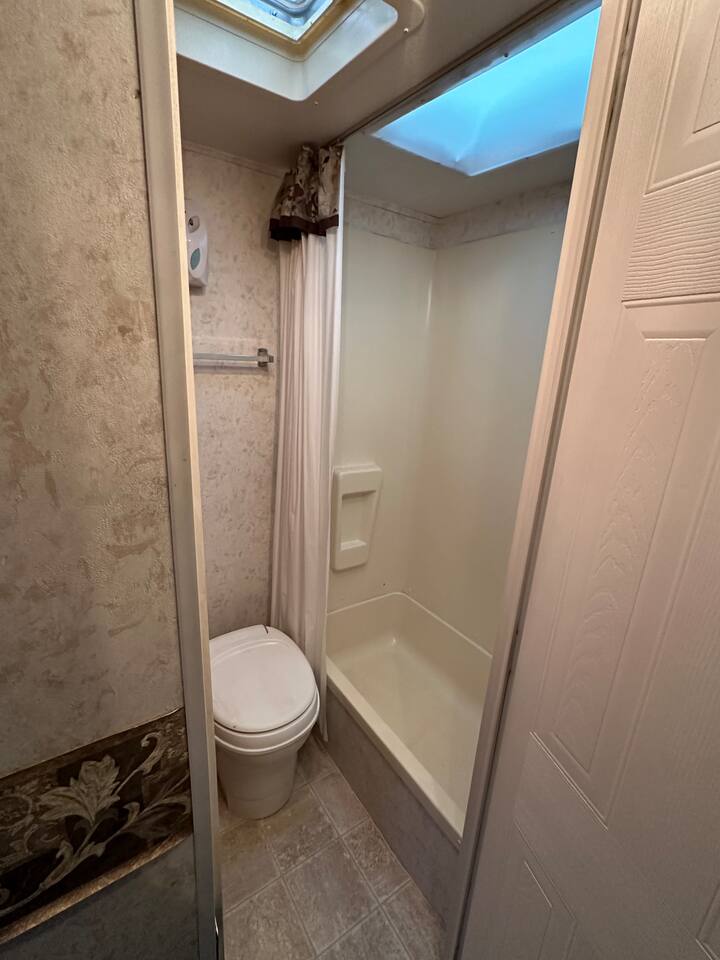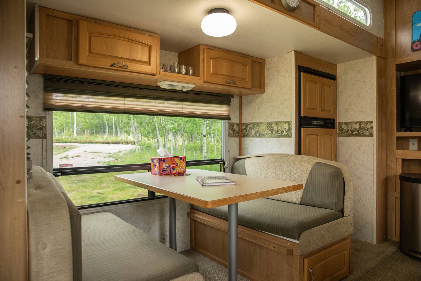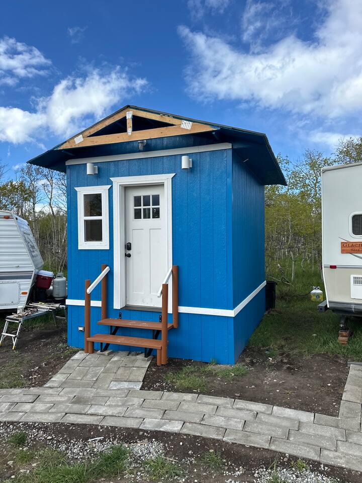 The trailer has a queen size matress bedroom with privacy folding door. In the living area there is a pull out cushion bed with a size best described as slightly wider than a twin. The trailer has a full compact bathroom with shower. There are spices and condiments in the fridge. The Borealis is located on a secluded area of a private acreage called Glacier Springs. There is a beautiful open area in front of the Borealis for parking, campfires and exploration.