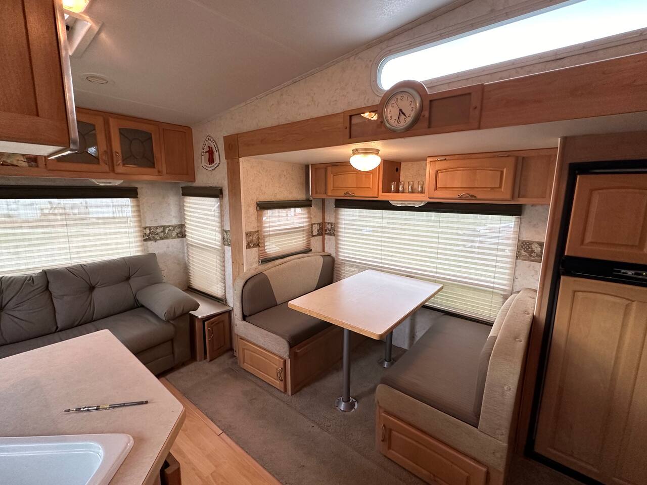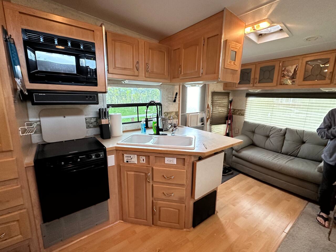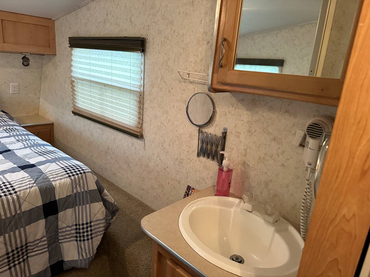The trailer has a queen size matress bedroom with privacy folding door. In the living area there is a pull out cushion bed with a size best described as slightly wider than a twin. The trailer has a full compact bathroom with shower. There are spices and condiments in the fridge. The Borealis is located on a secluded area of a private acreage called Glacier Springs. There is a beautiful open area in front of the Borealis for parking, campfires and exploration.