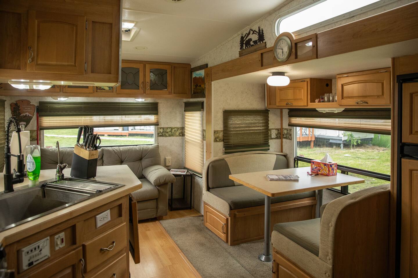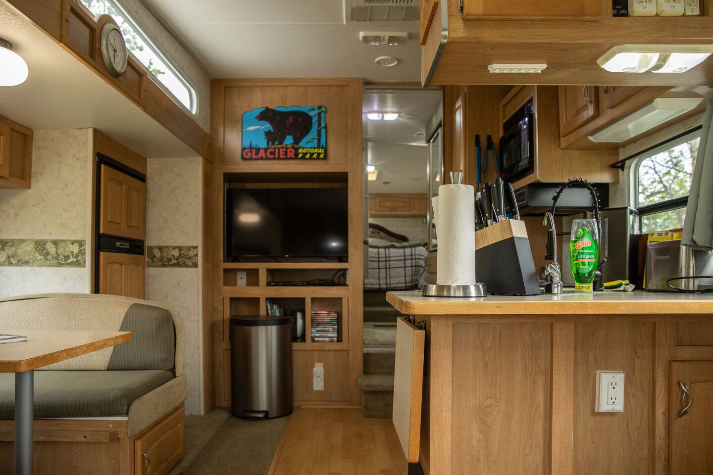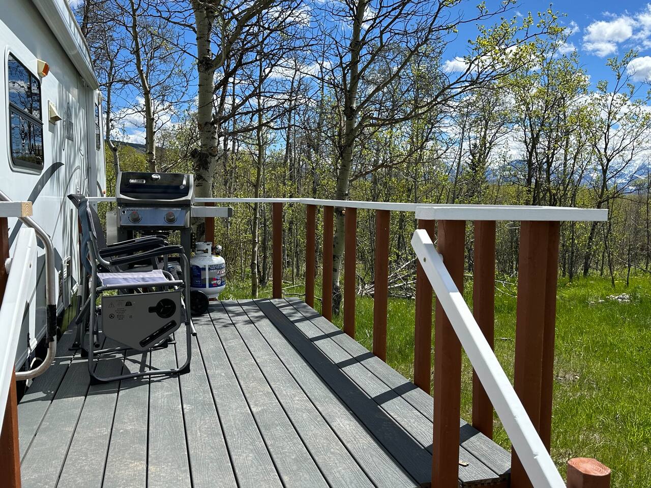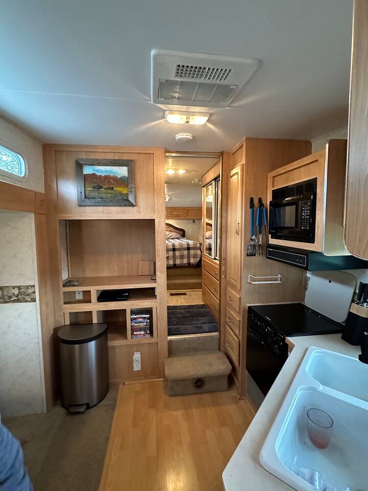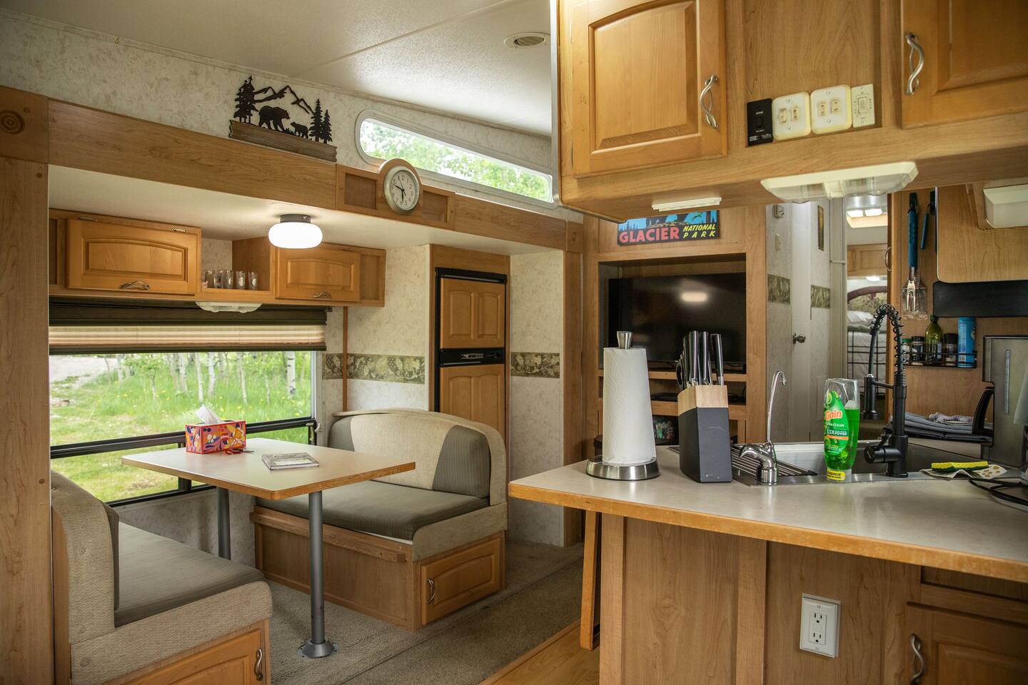 Glacier Borealis is a 27’ Glamping Trailer is located in a secluded clearing in a forest. As a guest of the Borealis you have access to a shared washer/dryer in an adjacent new wash house. There is a Weber grill. The Borealis is located 10 miles from both St Mary and Many Glacier Park Entrances near Babb, MT. This is a great budget option for 2 adults and a child. There is a common fire pit area with fire wood supplied. There is wildlife on the property and trails in the surrounding forest.