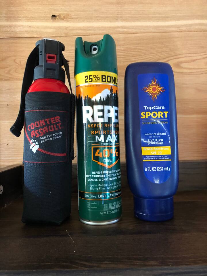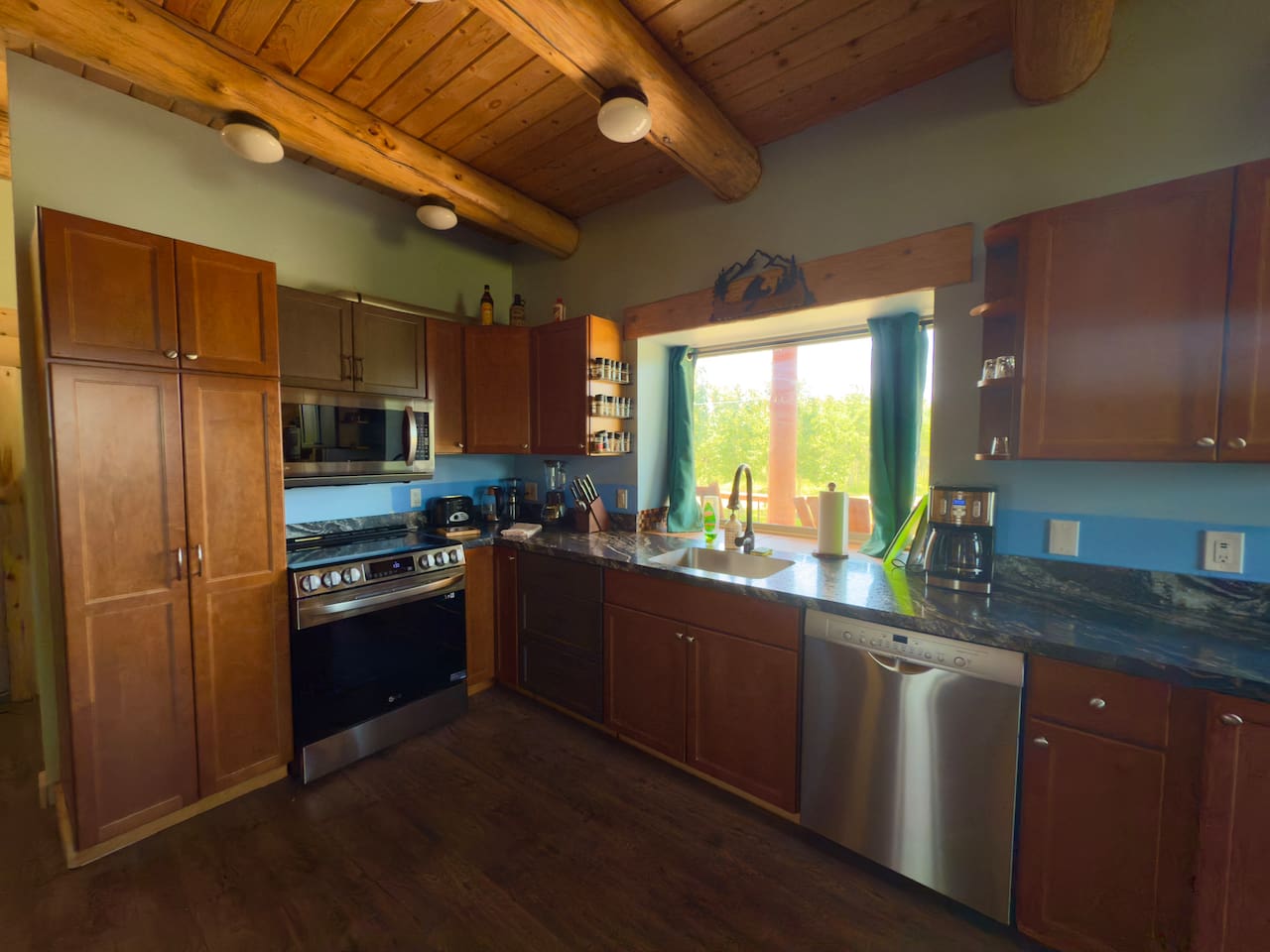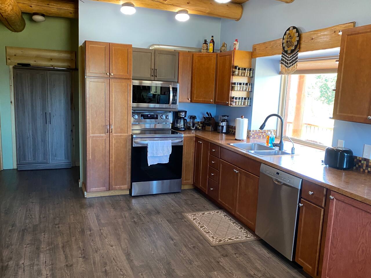 Kitchen has condiments, spices and typical kitchen appliances. We will have cans of bear spray and a few warm jackets a available for guest use. There is some canned food and common condiments for guest use.